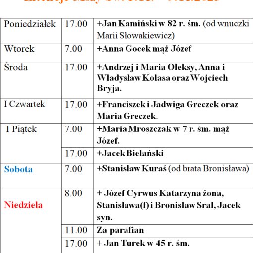 Czwartek –      g. 7.00   +Maria Siuty, mąż Stanisław