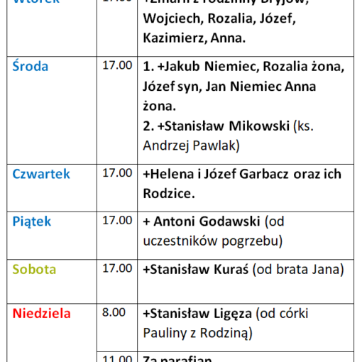 Wtorek – g. 7.00 1)+Stanisław Janczy w 9 r. śm.