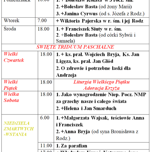 Intencje pogrzebowe  za † Anna Kolasa (01.04.2023r.) Z tych intencji zostanie odprawiona Gregorianka czyli 30 Mszy św. codziennie w dniach:             Od […]