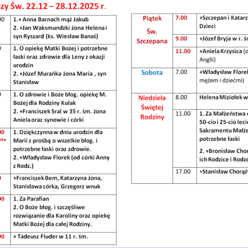 Opublikowano 24 czerwca 2023 Intencje Mszy św. Druga Gregorianka za +Annę Kolasa będzie odprawiona przez ks. Dariusza Czaję od 8 VIII do 6 IX 2023r