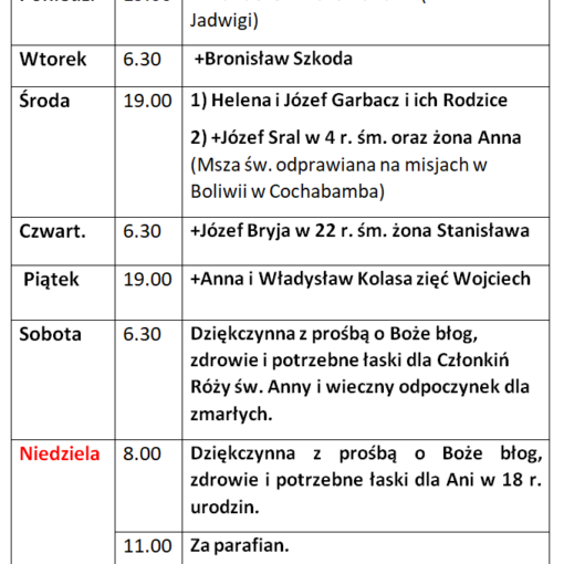 Msze św. w niedziele i święta: 8:00, 11:00, 17:00 (V-IX 18:00)