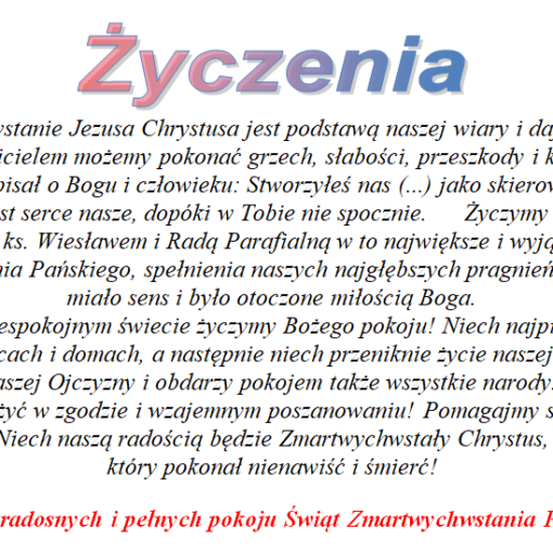 Czasopisma: „Gość Niedzielny”, „Mały Gość”,  „Staś” dla najmłodszych, Rycerz Niepokalanej. W zakrystii można nabyć baranki wielkanocne „CARITAS” na świąteczny stół. Kwota podstawowa to 8 zł. Dzieci mogą się włączyć w akcję na rzecz potrzebujących. Przy ołtarzu Krzyża są do zabrania skarbonki. Ćwiczenie silnej woli chroni nas na przyszłość np. przed uzależnieniami.