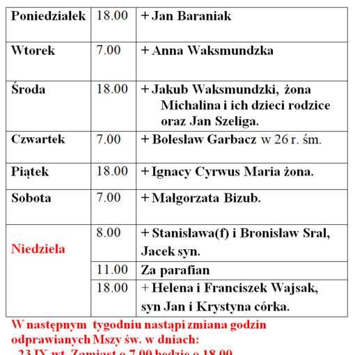 Opublikowano 19 marca 2023 Intencje Mszy św. Od czwartku – zmiana godzin Mszy św. wieczornej tylko w tygodniu na 18.00!