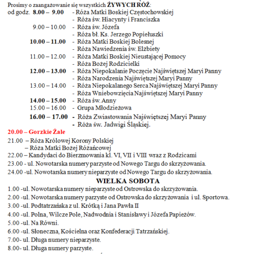 Bóg zapłać za posprzątanie naszej świątyni oraz ofiary na kwiaty: Wiktorowi Waksmundzkiemu, Elżbiecie Ścisłowicz, Stanisławowi Cyrwus, Helenie Trąbka, Joannie Maryniarczyk, Jadwidze Kuchta, Aleksandrze Garcarz, Iwonie Sral, Ewelinie Lorek.