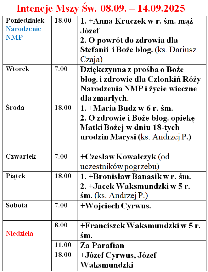 Intencje Mszy św. 8-14.09.2025