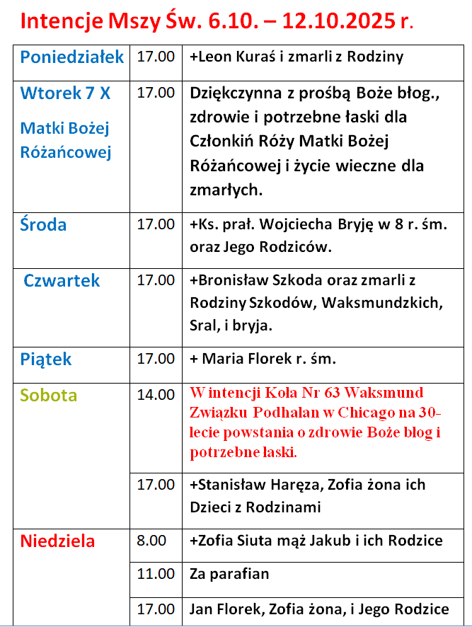 Intencje Mszy św. Intencje Mszy św. 6-12.10.2025 przez Krzysztof Król|Opublikowano 5 października 2025