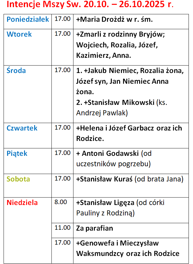 Strona Główna » Intencje Mszy św. » Intencje Mszy św. 20.10-26.10.2025