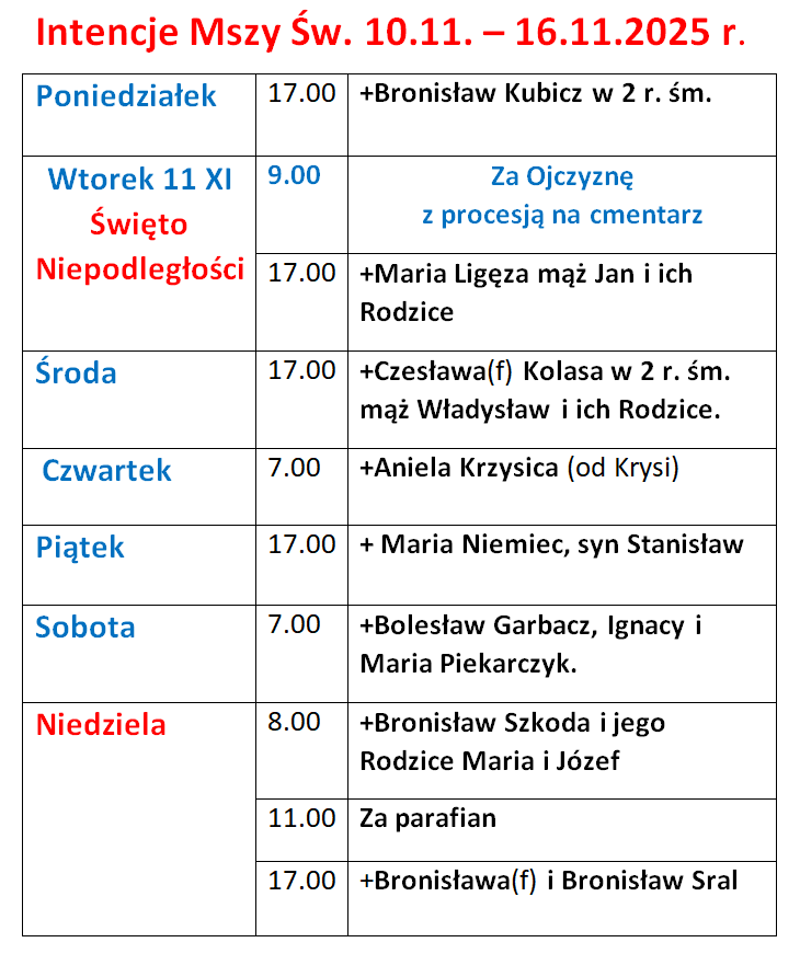 Intencje Mszy św. 10-16.11.2025