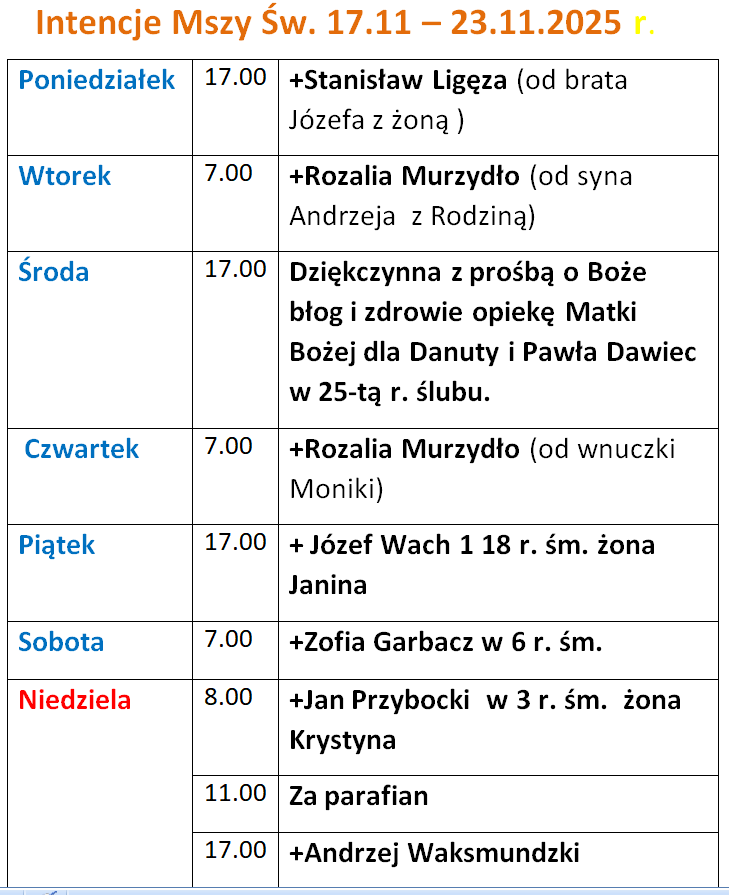 Intencje Mszy św. Intencje Mszy św. 17-23.11.2025 przez Krzysztof Król|Opublikowano 22 listopada 2025