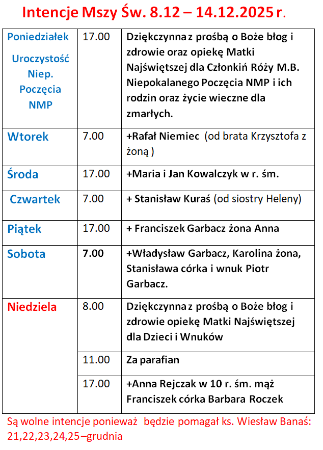 Opublikowano 18 lipca 2020 I N T E N C J E M S Z Y Ś W. 20VII-26VII 2020 r. Poniedziałek – g. 18.00 +Czesław Sral, syn Paweł Wtorek – g. 7.00 +Zofia Garbacz (od syna Jana z żoną) Środa – g. […]