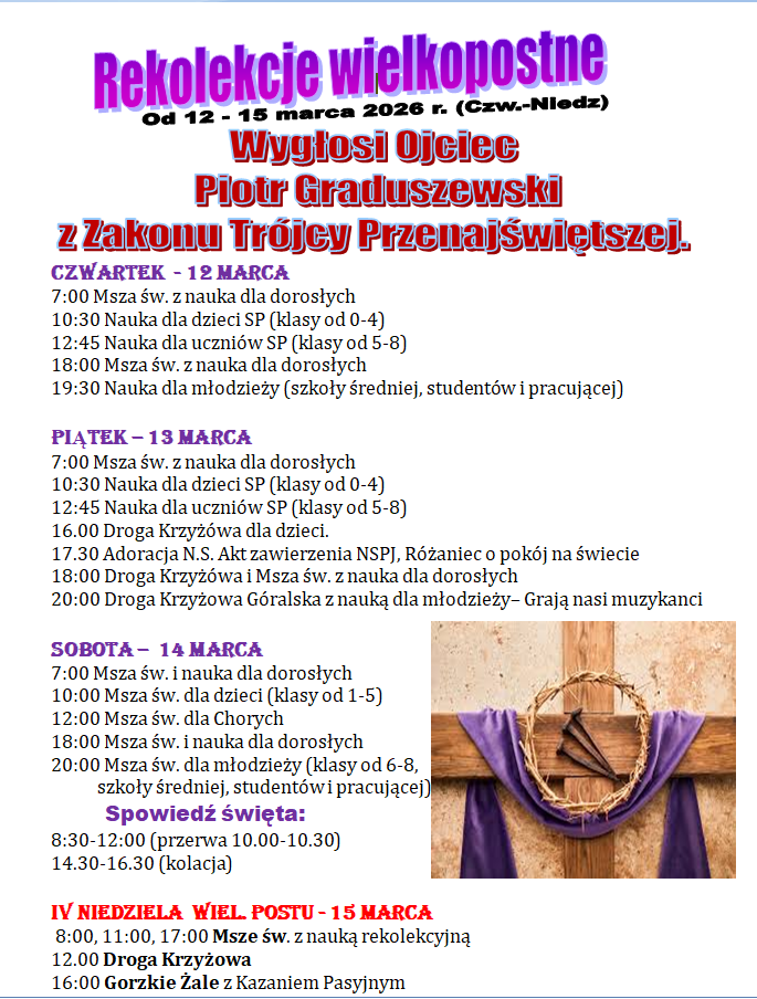 Ogłoszenia duszpasterskie Ogłoszenia duszpasterskie – Rekolekcje Wielkopostne 12-15 marca 2026 przez Krzysztof Król|Opublikowano 7 marca 2026