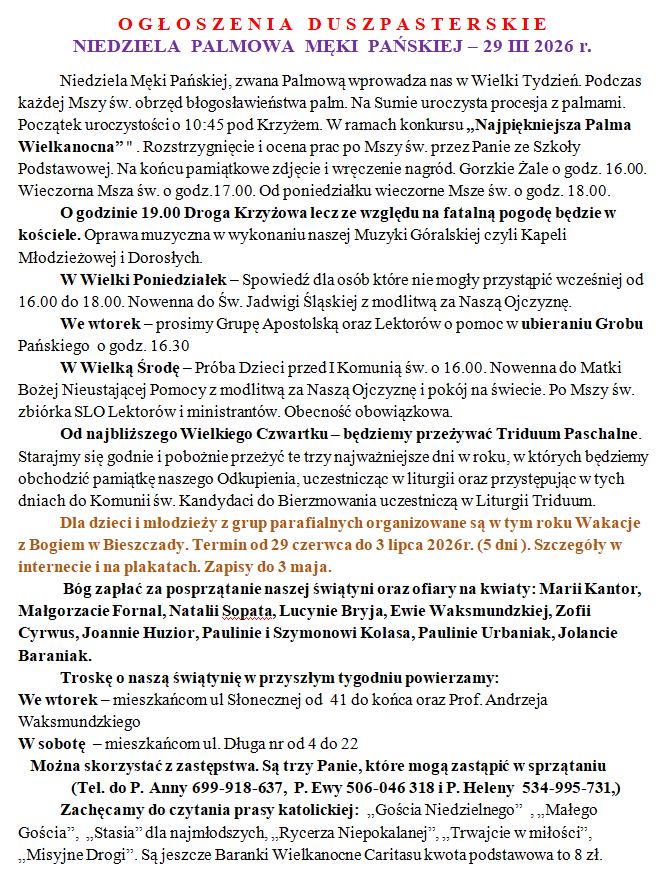 Ogłoszenia duszpasterskie Ogłoszenia duszpasterskie Niedziela Palmowa-29.03.2026, Triduum Paschalne przez Krzysztof Król|Opublikowano 28 marca 2026