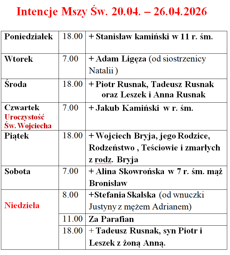 Opublikowano 20 listopada 2022 Intencje Mszy św. Intencje pogrzebowe za † Annę Rusnak (21.10.2022r.) Z tych intencji zostaną odprawiona Gregorianka czyli 30 Mszy św. codziennie w dniach: od 1 […]