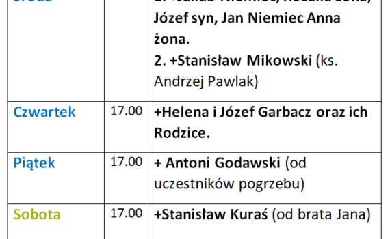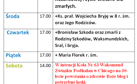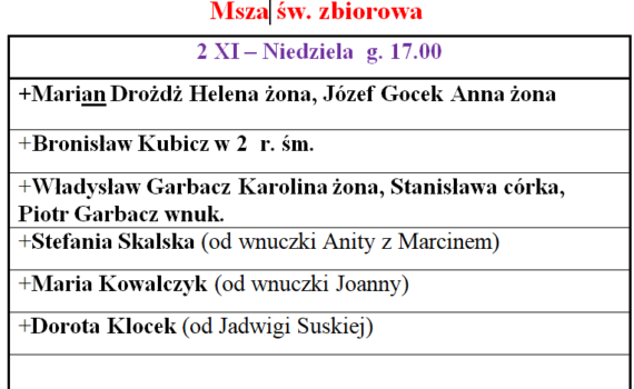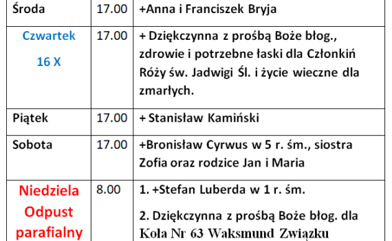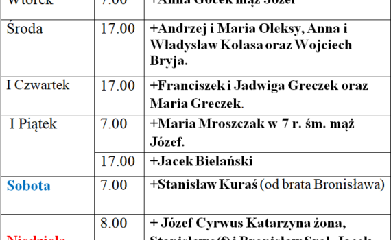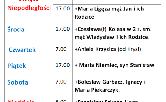 Msze św. w niedziele i święta: 8:00, 11:00, 17:00 (V-IX 18:00)